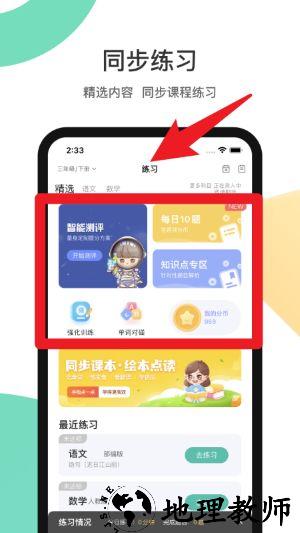 5、在练习栏目中可进入智能测评、每日10题、知识点专练等区域,全面提升学生的学习能力与效率。