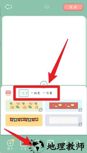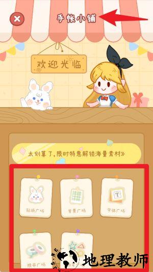 1、进入手帐小铺页面后,可在贴纸、背景、字体、胶带与画笔五大广场中选择所需装饰素材使用。