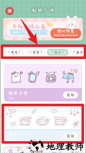 2、在贴纸广场中,用户可通过萌宠、美食、甜系等分类浏览贴纸,点击获取即可添加入手帐中使用。