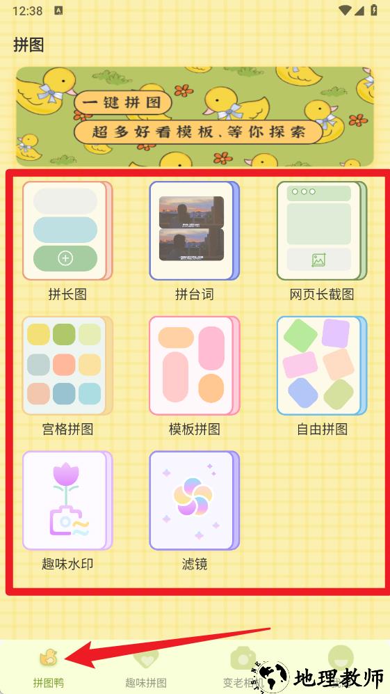 2、拼图鸭提供多种拼接方式,包括拼长图、拼台词、模板拼图和自由拼图,满足不同创意需求。