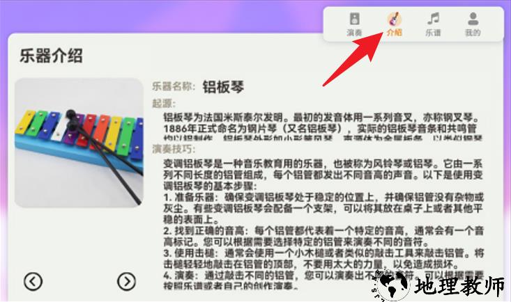 2、乐器介绍模块提供详细的背景知识和使用方法,帮助用户更好地了解乐器特点与演奏技巧。