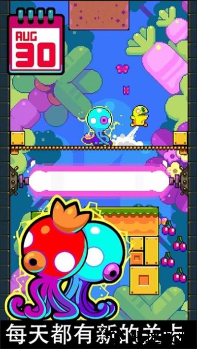 闰日(leap day)是一款非常有趣的像素风格休闲闯关游戏。游戏画面色彩丰富,音乐轻快动感,让玩家仿佛回到了小时候玩红白机的时代。游戏的玩法简单易懂,但又不失挑战性,玩家需要灵活控制角色的跳跃和移动,躲避陷阱和敌人,收集水果以提高分数。游戏每天更新一个关卡,保持了游戏的新鲜感和可玩性。同时,游戏还支持社交分享功能,让玩家可以与朋友分享自己的游戏成绩和成就。总的来说,闰日(leap day)是一款值得一试的休闲闯关游戏。