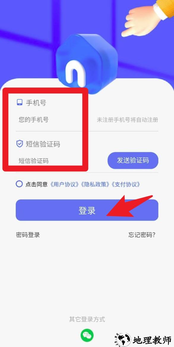 1. 打开App后输入手机号及验证码,点击底部按钮完成登录并进入系统首页。