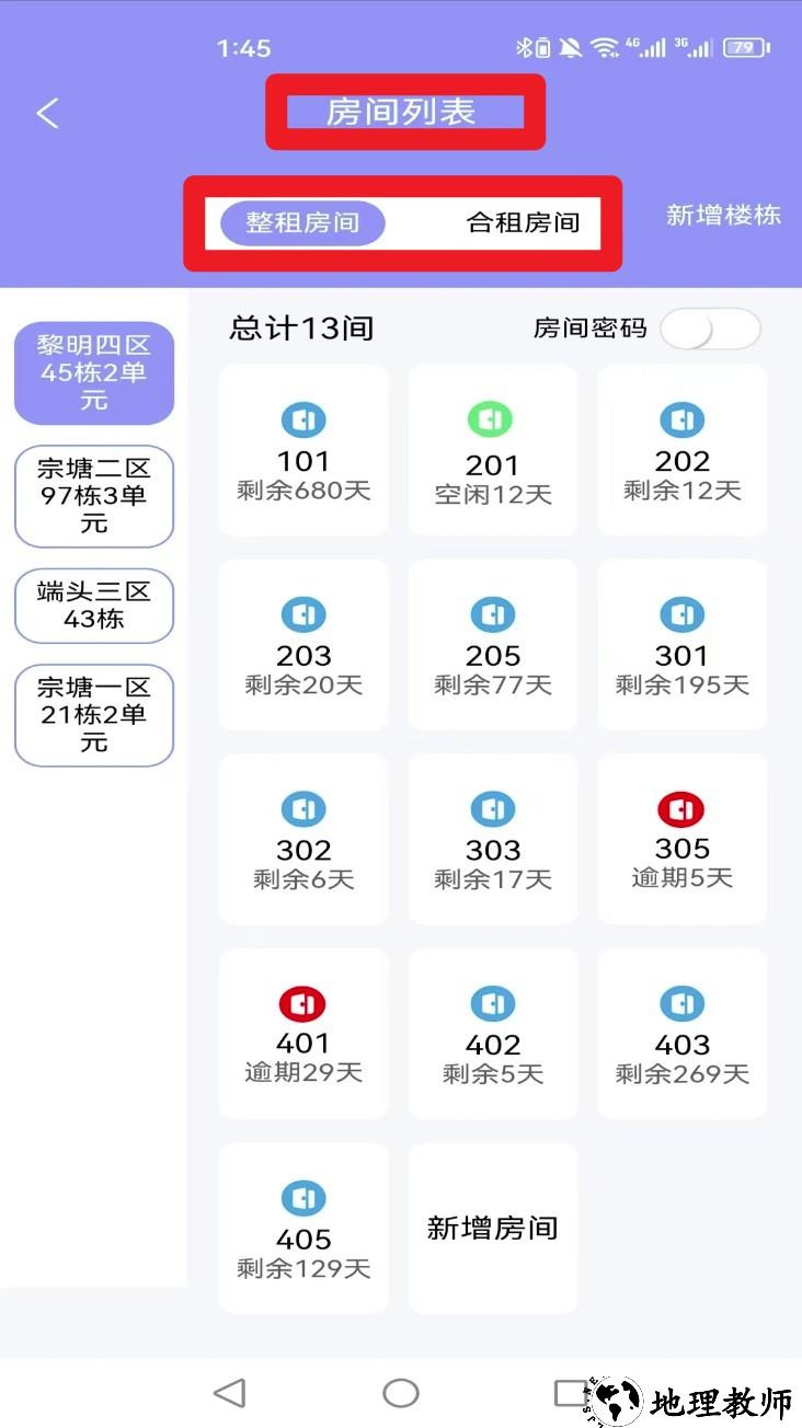 3. 点击房间列表可切换查看整租或合租房源,快速掌握剩余天数与状态。