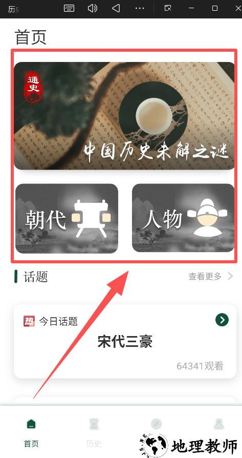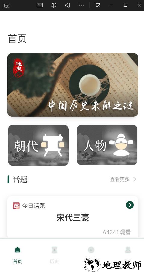 1.打开App后首先看到的就是首页,这里会推荐一些重磅或有趣的历史内容,如“中国历史未解之谜”、“宋代三豪”等。