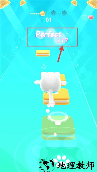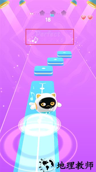2、操控小猫在蓝色平台移动,找准节奏,获取【Perfect】评价。