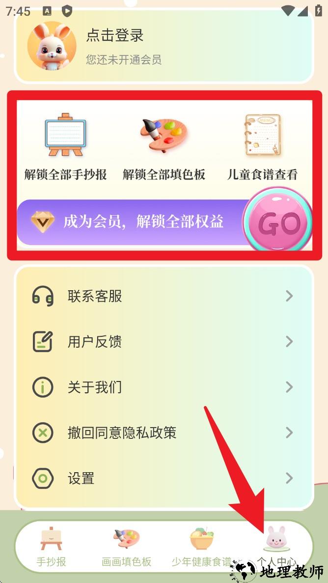 5. 点击个人中心,可进行会员解锁、联系客服、查看用户协议与隐私设置等操作。