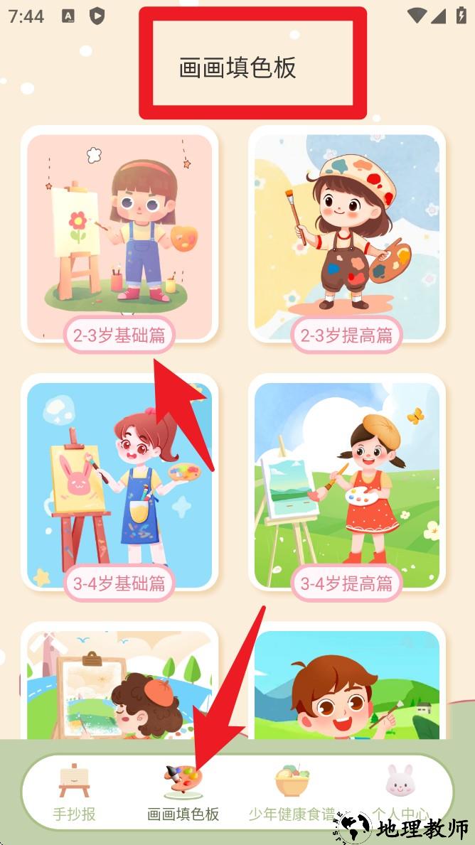 3. 在底部菜单栏选择画画填色板,可进入适龄分区选择 2~4 岁不同阶段的涂色练习。