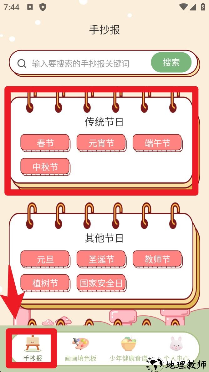 1. 进入首页点击下方手抄报按钮,可浏览传统节日和其他节日的手抄报主题分类。
