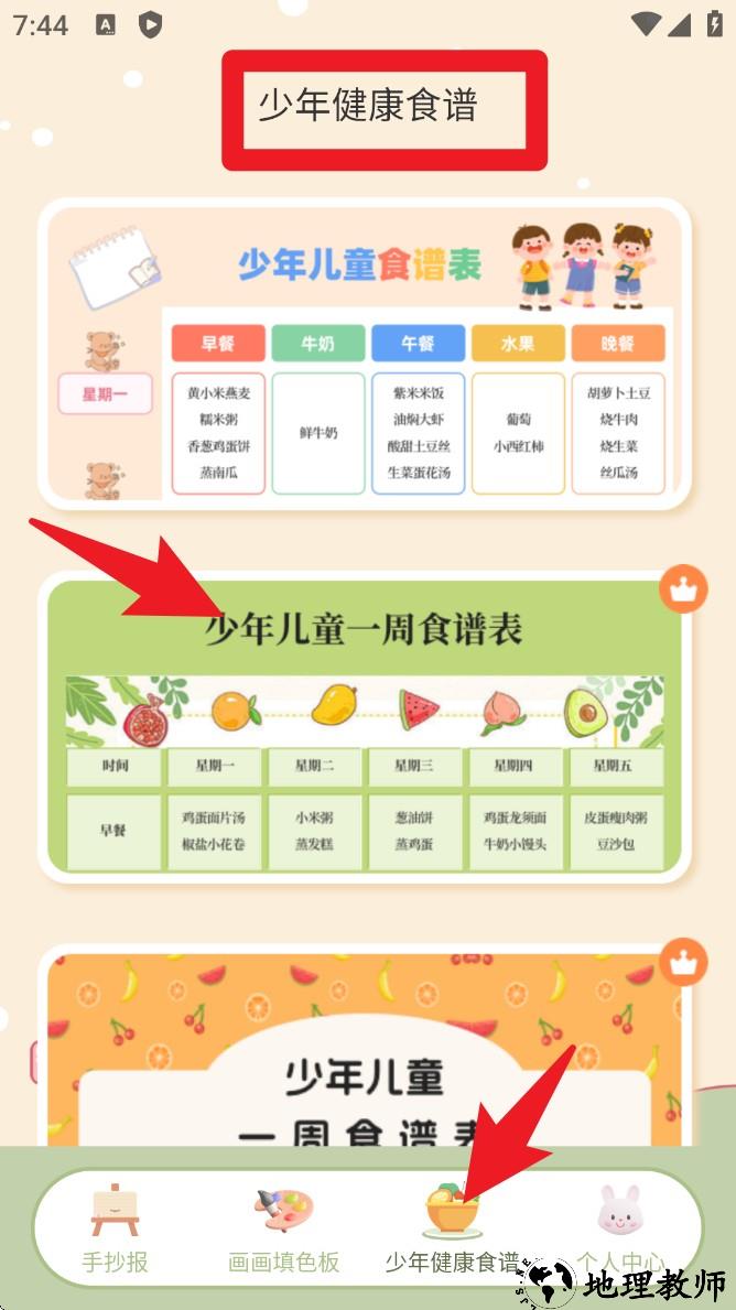 4. 切换至少年健康食谱标签页,可查看一周营养搭配表,轻松安排每日饮食内容。