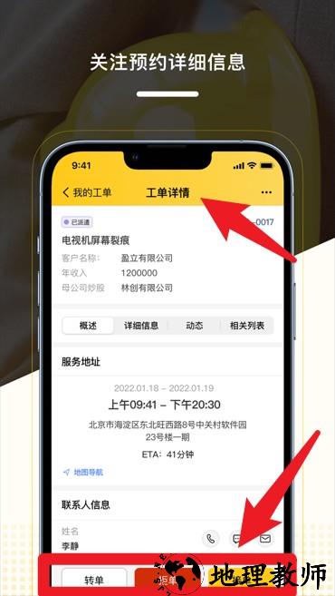 4、进入工单详情页后可查看客户信息、地址与服务时间,并选择接单、转单或拒单。
