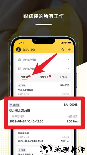 2、在首页可查看待接单、待派工与已完成工单状态,轻松追踪所有工作进度。
