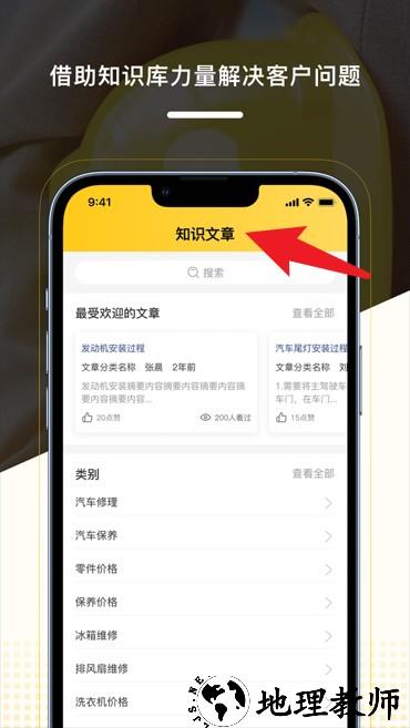 5、进入知识文章页面,快速查阅热门文章与维修相关分类,高效解答客户问题。