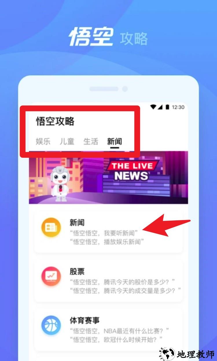 3. 前往悟空攻略版块,切换到新闻标签后,即可通过语音指令播放今日新闻、体育赛事等资讯内容,边听边学。