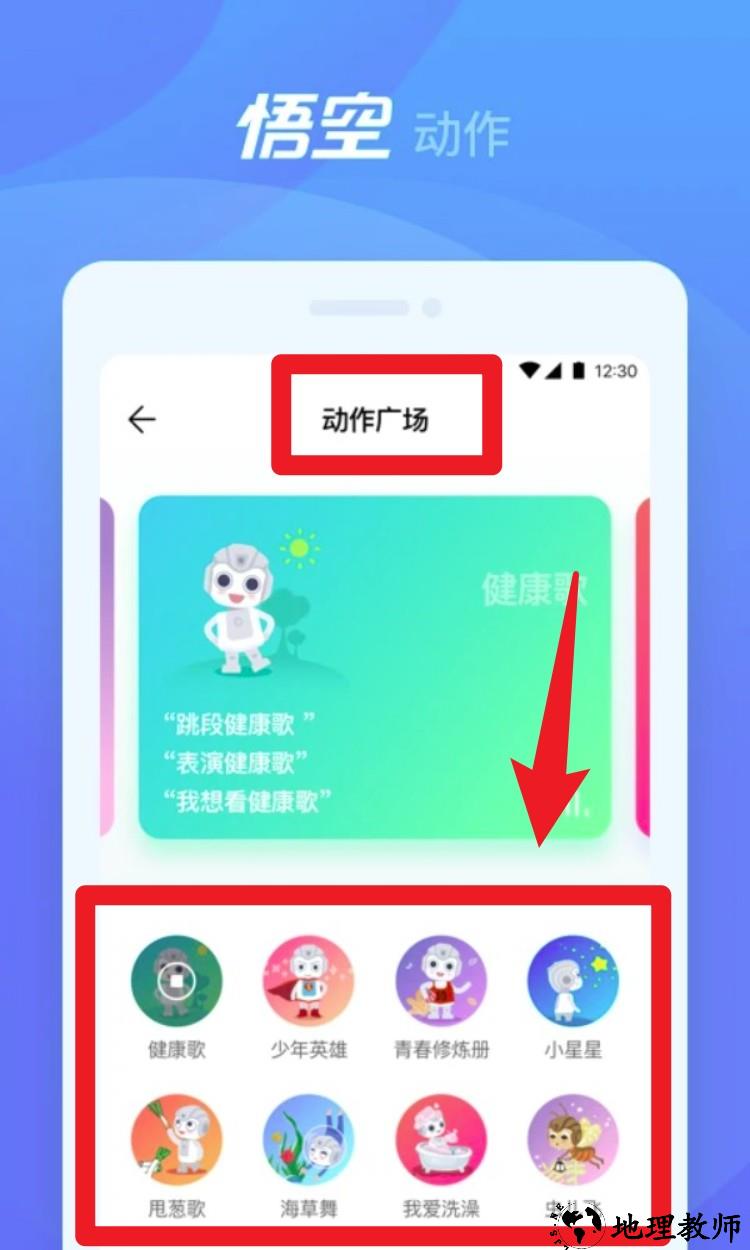 1. 进入首页点击动作广场,可选择如《健康歌》等动作歌曲,让机器人跟着节奏舞动,陪伴孩子一起活动身体。
