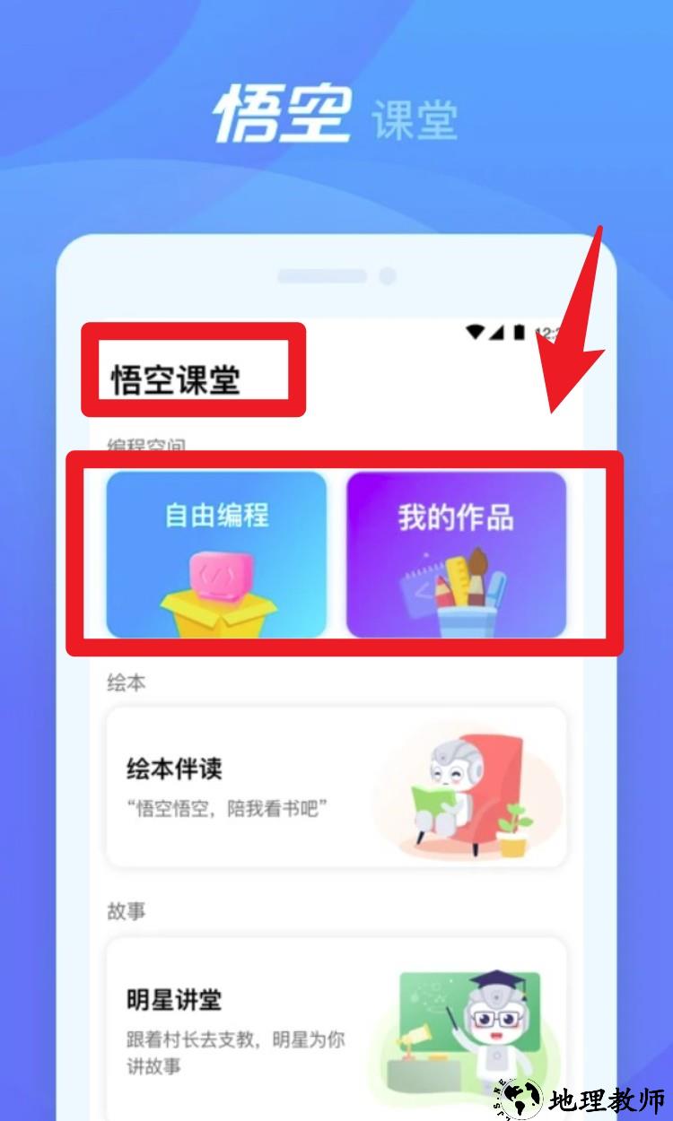 2. 在悟空课堂中点选自由编程或我的作品,孩子可进行简单逻辑搭建,也能上传自己的语音或图片进行创意展示。