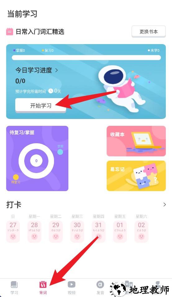 2、点击下方背词图标进入词汇学习页,可查看每日进度并点击开始学习正式背词。