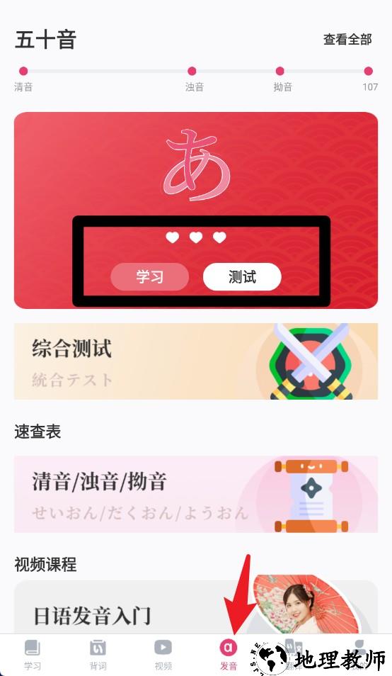 3、在五十音学习页面中,可选择学习或测试模式,加强清音、浊音与拗音的听写训练。