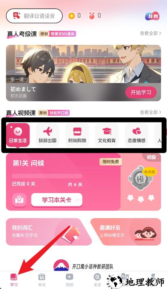 1、点击底部学习图标可进入日常生活关卡,选择分类主题课程开启互动式日语学习。