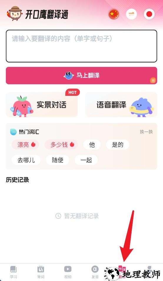 4、点击底部翻译按钮可进入翻译页面,支持文本与语音输入,满足不同情境下翻译需求。