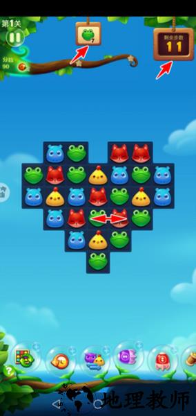 3、接下来,由于消除了 3 个青蛙,上方的任务牌就变成 7 了;同时由于用掉了 1 步,可用步数也变成 11 了。
