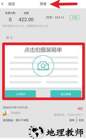 3、点击拍摄区域上传箱单照片,填写备注内容后提交预录,可实时查看余额与费用说明。