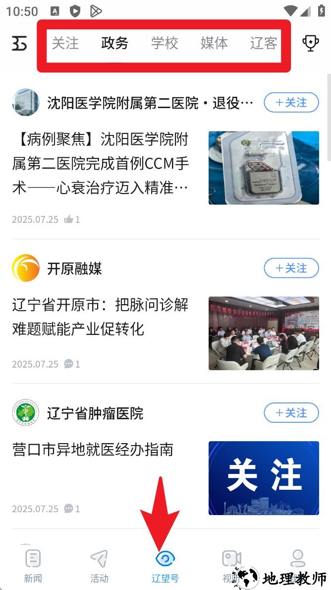 3. 点击下方辽望号进入内容发布平台,可浏览医院、政务、学校等入驻账号发布的权威信息,支持一键关注。