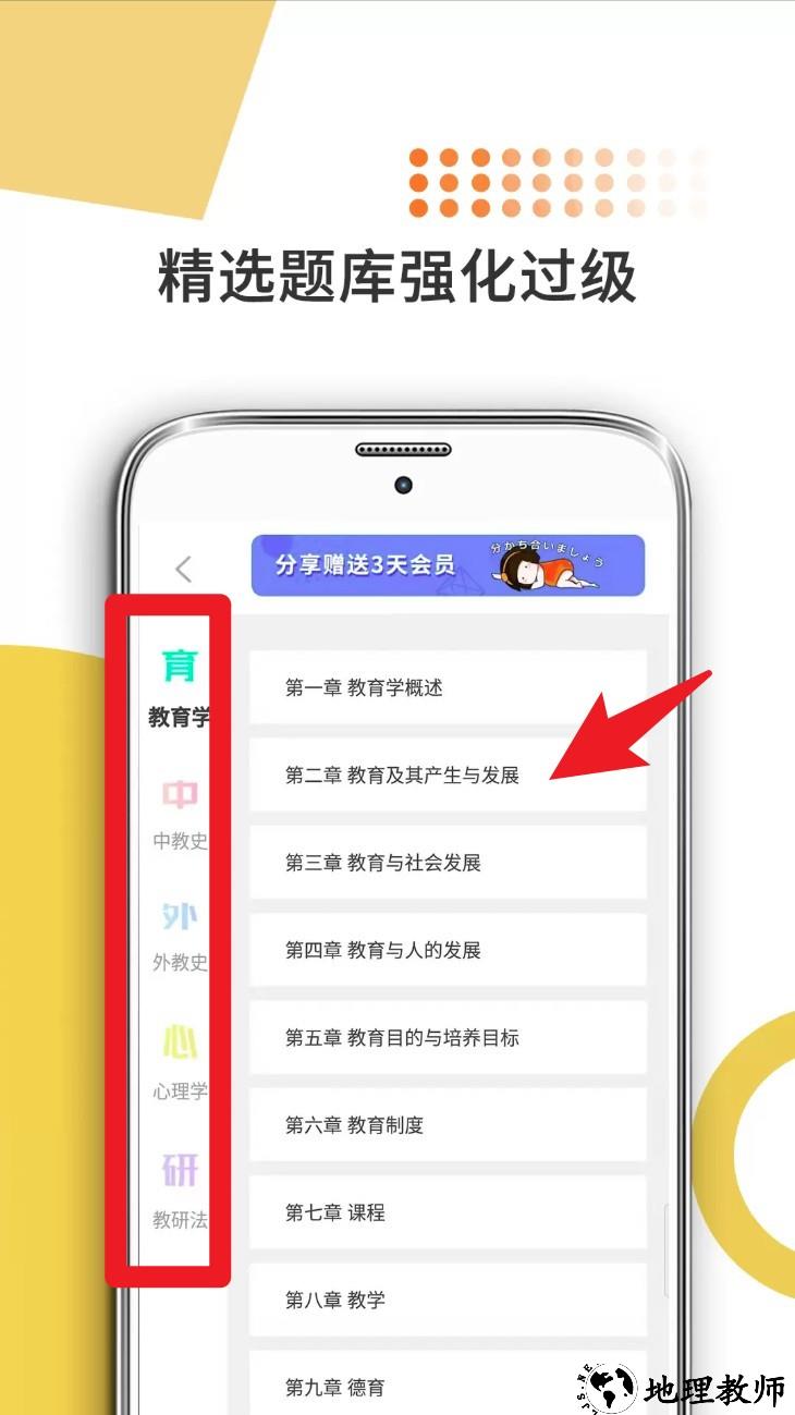 2. 登录成功后,在首页点击教育学考研模块,进入各章节的题库练习界面。