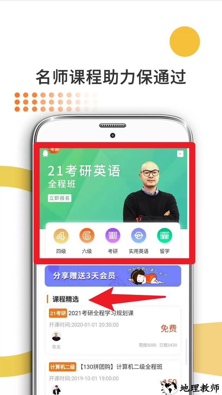 4. 返回首页,点击考研课程,可查看老师授课班级与热门付费课程内容。