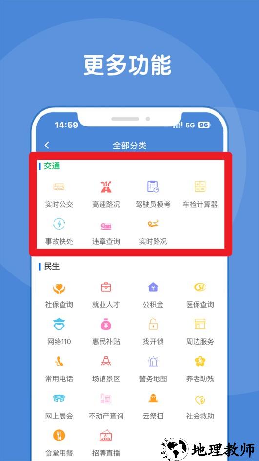 1. 进入全部分类页面可查看交通、民生等功能,支持公交、违章、不动产等查询。
