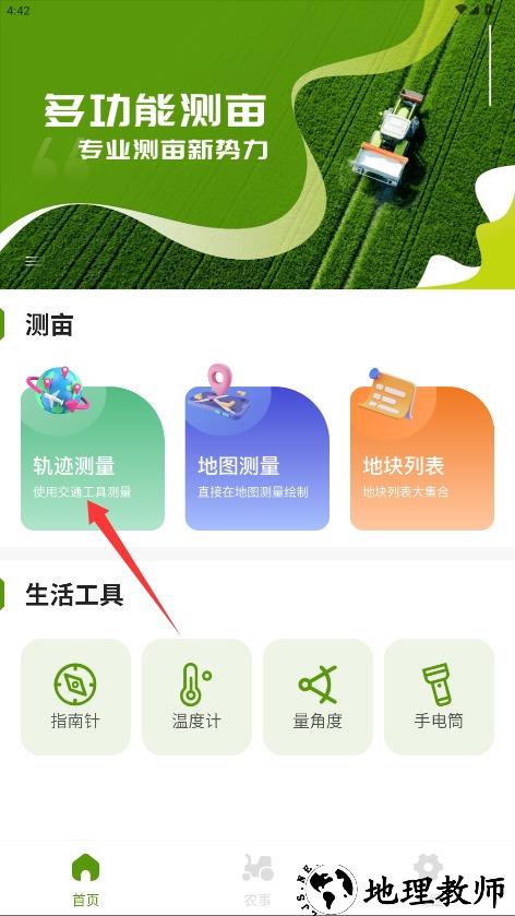1、打开应用主界面选择面积测量功能,进入轨迹记录模式准备开始土地勘测。