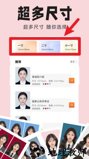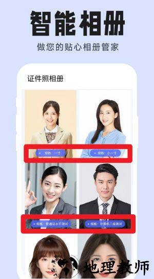 2、规格适配:内置多种国际标准证件照尺寸模板,满足各类证件需求。