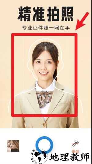 2、进入拍照界面后,根据画面中的引导线摆正头部和肩部,点击拍摄即可获得标准证件照片。