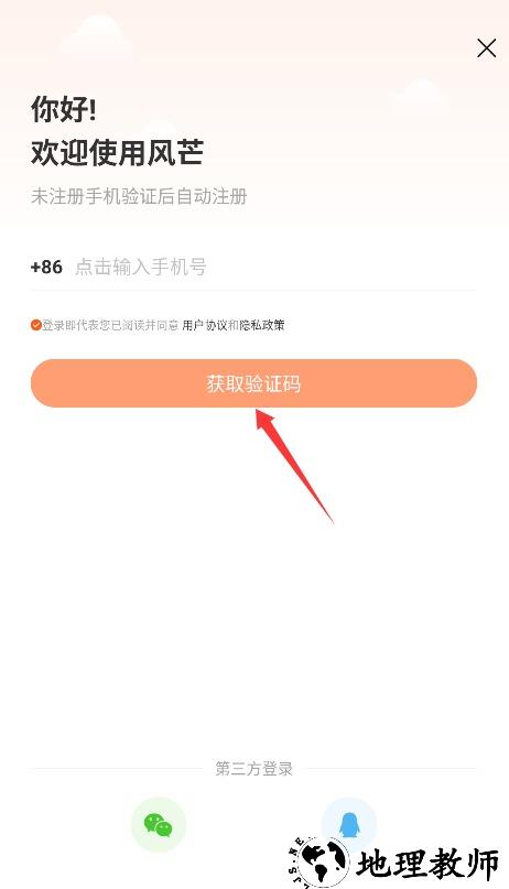 2、在登录页面填写手机号码获取验证码,输入验证信息并同意用户条款后完成账号登入。