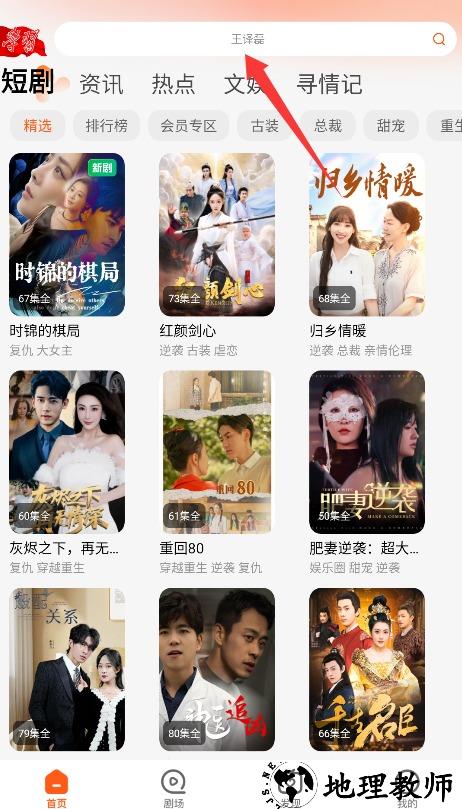 3、进入平台首页后,通过顶部搜索栏输入短剧名称或类型关键词,即可查找并观看相关内容。