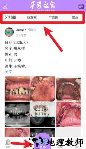 4、牙科圈模块支持发布病例、查看朋友圈与广告内容,还可根据地理位置浏览附近牙医分享。