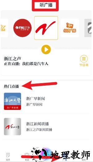 4、点击底部广播进入听广播界面,可收听浙江之声等频道,并查看热门音频节目。