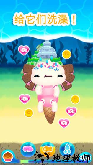 3. 洗澡:点击“水滴”图标,拖动花洒为蝾螈清理身上的泥垢。