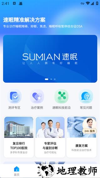 1、首页:提供速眠精准解决方案,涵盖测评、案例、科技前沿、常见问题,还有医院、专家、康复方案等睡眠健康服务入口;