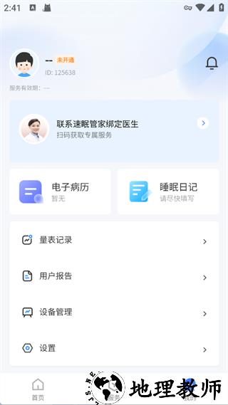 3、我的:提供绑定医生、电子病历、睡眠日记、量表记录、用户报告、设备管理及设置等个人睡眠健康管理功能。