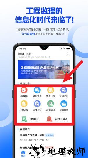 3、点击首页现场工作区域集中展示创建项目、文件管理、日志记录等功能,方便监理全过程管理。