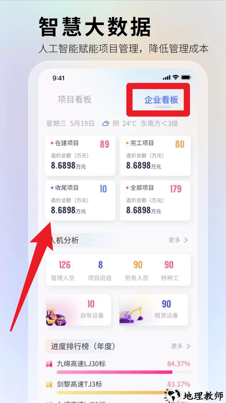 2. 进入首页后点击企业看板,可快速查看在建、完工、收尾项目等关键数据总览。
