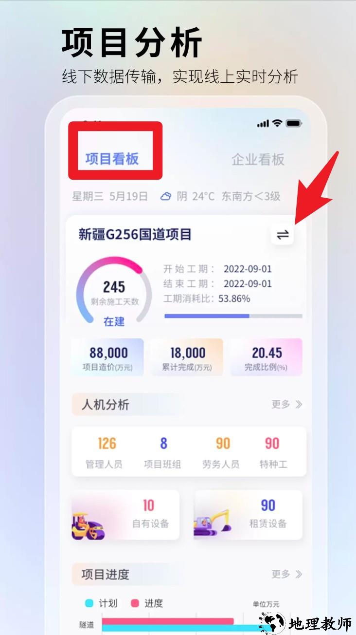 3. 点击项目看板切换查看详细工程数据,包含进度、造价、人员设备等实时更新内容。