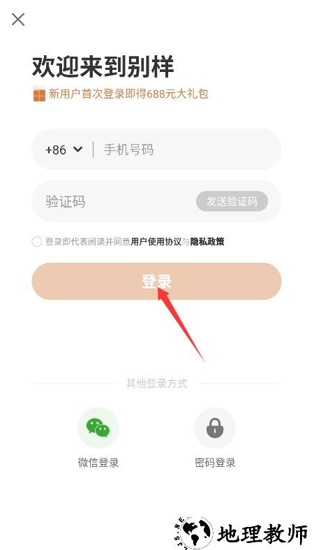 2、在登录页面填写手机号获取验证码,输入验证信息并同意用户条款后完成账号登入。