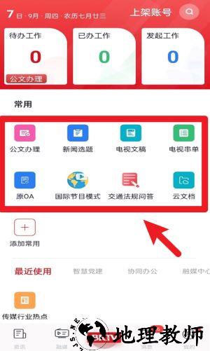 2、首页常用功能包含公文处理、新闻选题、电视文稿等高频工具,可根据岗位需求添加更多常用快捷入口。