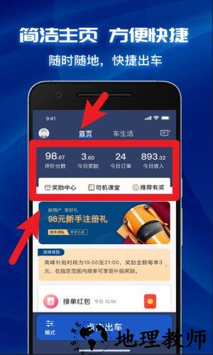 1、打开首页后即可查看评分、奖励、订单和收入等数据,轻松掌握今日运营状况。