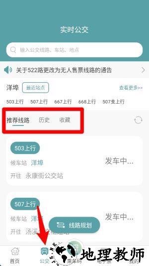 3、点击底部公交按钮即可进入实时公交页面,查找站点与推荐线路均在此操作。