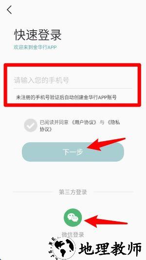 1、打开app,用户可通过输入手机号或微信授权方式登录金华行APP,首次登录将自动创建账号。