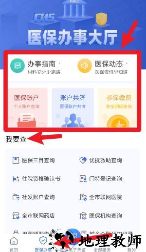 3、点击底部医保办事栏目,进入医保办事大厅后可查医保账户、账户共济、参保缴费等详细信息。