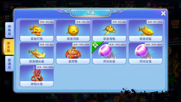 分值200,颜色是金黄色的,个头比蓝色的鲨鱼还要大些。只要遇见就不应该放过,打中一条金鲨比你打其他N多小鱼都要划算。而且一般情况下最好用6号或者7号炮来打,虽然那样消耗的炮弹数会很多,但成功的几率是蛮可观的,一般情况下,成功的概率都在50%左右。
